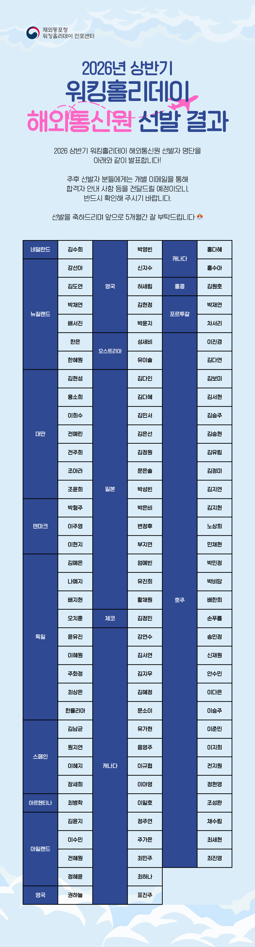 2026 상반기 워킹홀리데이 해외통신원 선발자 명단을