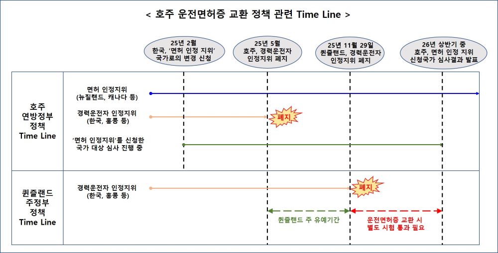 o 호주 연방정부는 지난 2025년 5월 1일 부로 변경된 정책을 발표했지만, 각 주 정부별로 정책을 적용하는 시기가 다르며 퀸즐랜드 주정부는 2025년 10월 현재로서는 시험을 치르지 않고도 운전면허증 교체 발급 가능