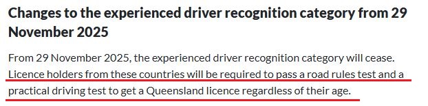 o 하지만, 2025년 11월 29일부터는 퀸즐랜드 주에서도 한국 운전면허증을 호주 운전면허증으로 교체 발급을 하기 위해서는 별도 시험 의무가 부과될 예정 (2025년 10월 7일 퀸즐랜드 주정부 공지 ← 링크 클릭)