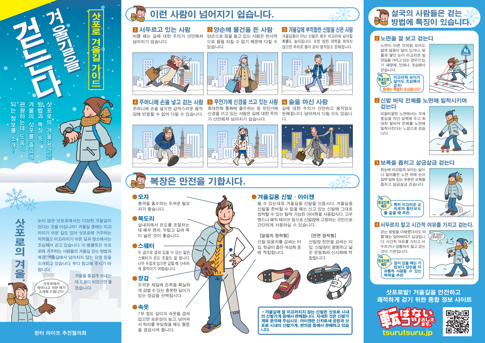 삿포로 지역은 겨울철 제설이 되어 있지 않거나 결빙되어 있는 도로 및 보도에서 미끄러져 부상을 당할 위험이 높습니다. 재외 국민 및 관광객 여러분께서는 아래의 안내사항을 참고하시어 안전에 유의하시기 바랍니다.