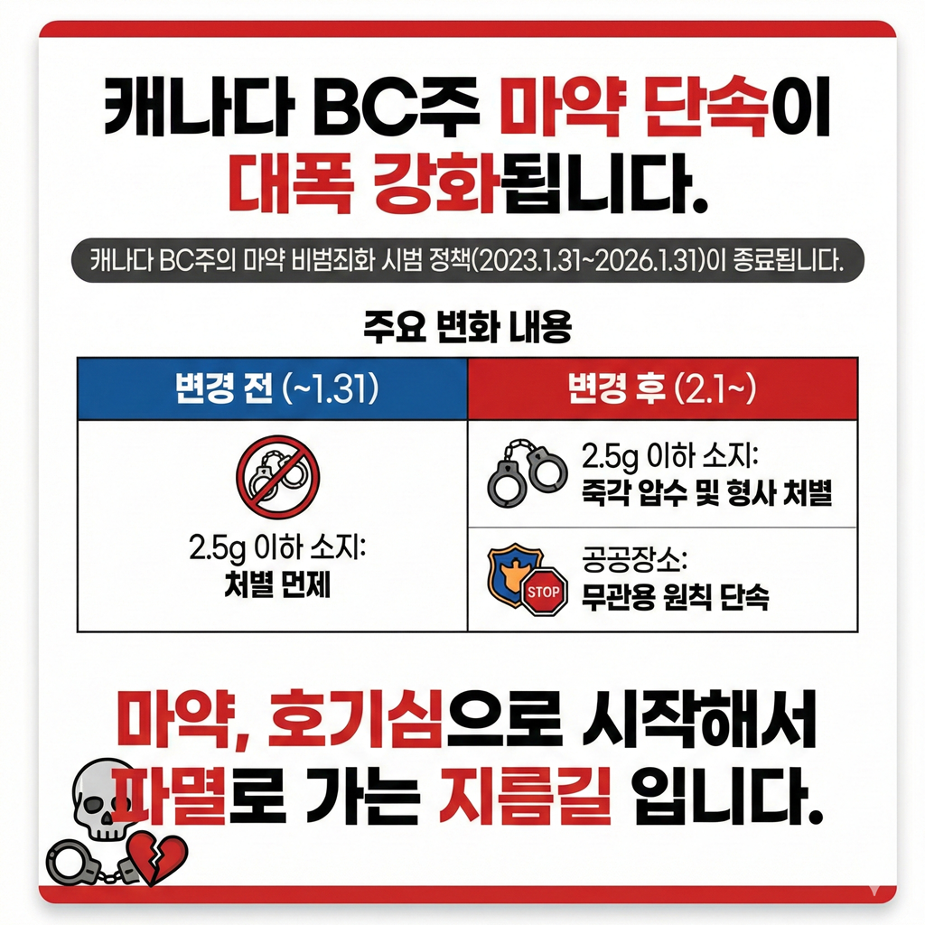 최근 브리티시컬럼비아주 정부는 3년간 한시적으로 시행해 온 '소량 마약류 소지 비범죄화 시범사업'을 연장 없이 2026.1.31. 부로 종료할 것을 발표하였습니다.